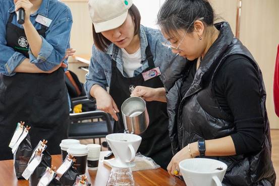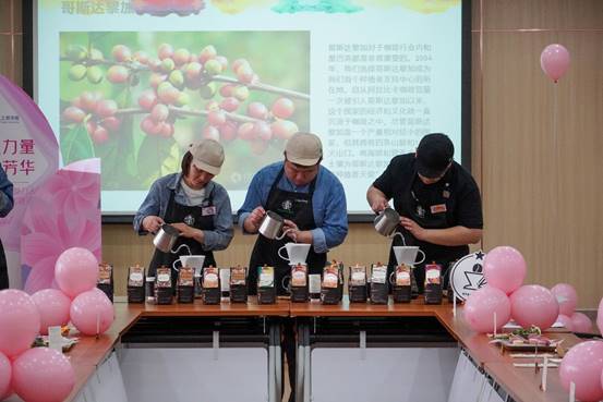 活动在咖啡体验中开始,星巴克团队为老师们介绍咖啡故事,讲解咖啡文化,教学咖啡制作技巧,并由学院教师参与其中共同体验咖啡制作。